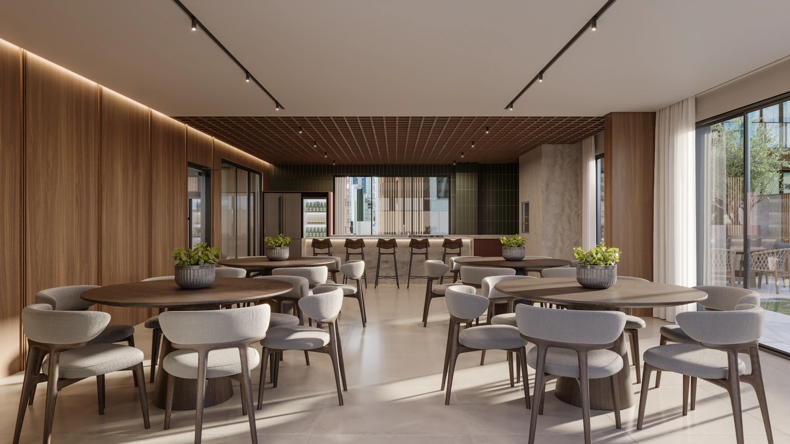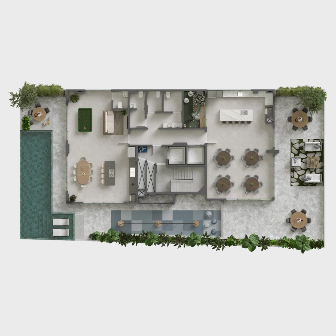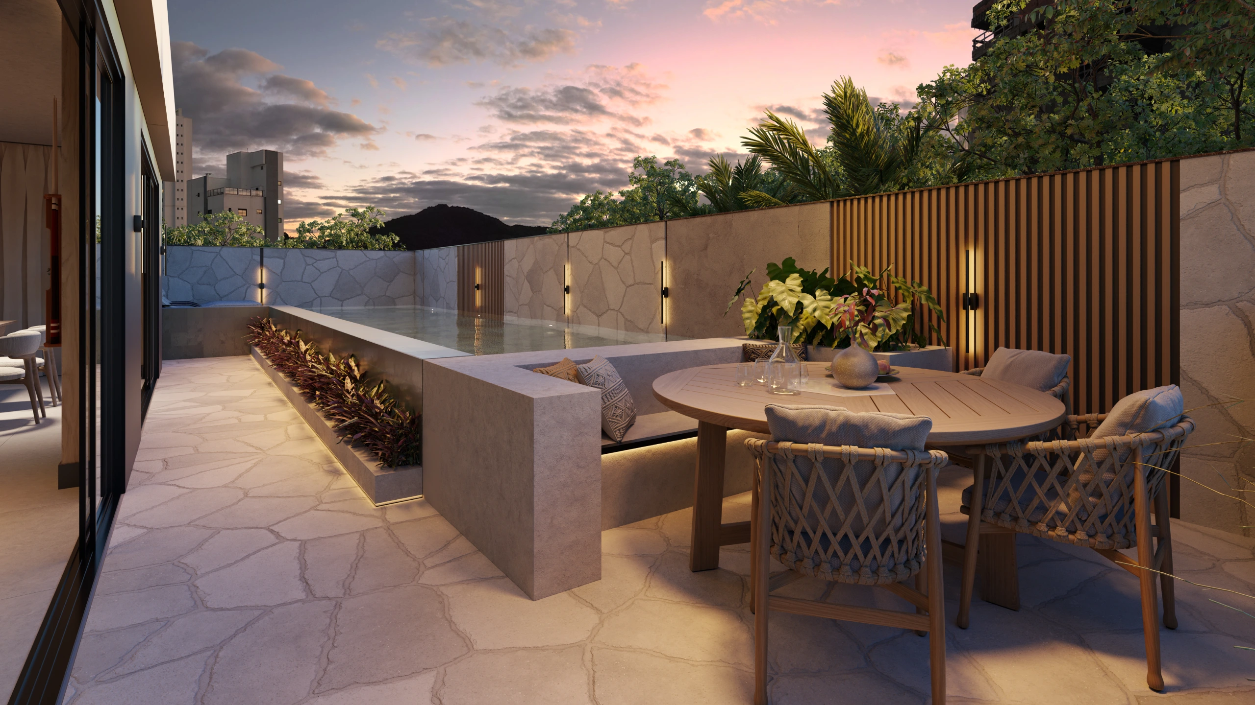 Projetada para proporcionar momentos de descanso e interação em um ambiente que harmoniza elegância e natureza.